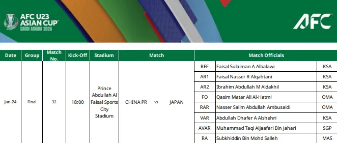 主裁判:费萨尔·苏莱曼·A·阿尔巴拉维(沙特阿拉伯)